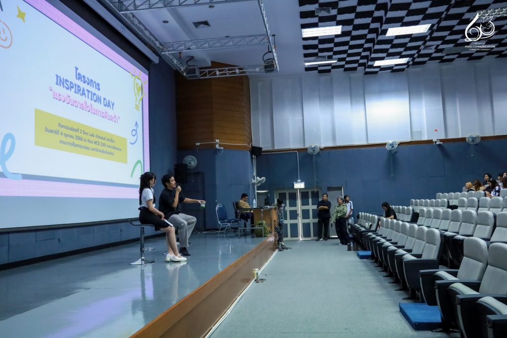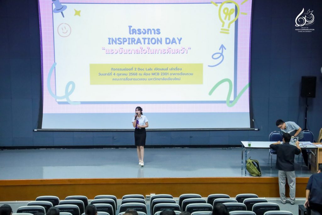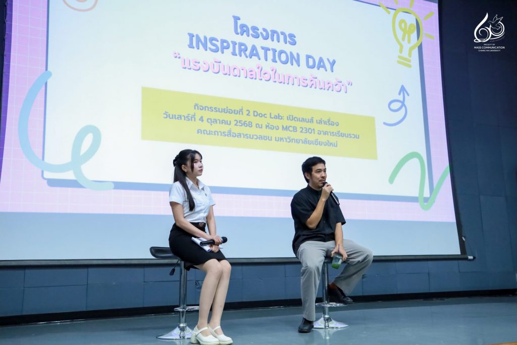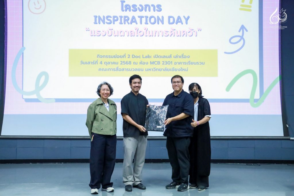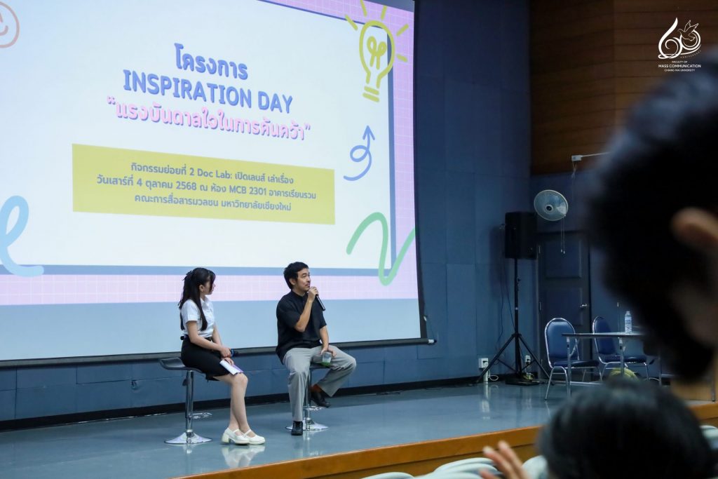 คณะการสื่อสารมวลชน มหาวิทยาลัยเชียงใหม่ จัดกิจกรรม Inspiration Day แรงบันดาลใจในการค้นคว้า “Doc Lab: เปิดเลนส์ เล่าเรื่อง” โดยได้รับเกียรติจาก คุณไก่ ณฐพล บุญประกอบ ผู้กำกับภาพยนตร์สารคดีและผู้กำกับซีรีส์ชื่อดังบน Netflix มาร่วมบรรยายพิเศษในหัวข้อ “The Art of Adaptation: แปลงความจริงเป็นหนัง” ถ่ายทอดแนวคิดและแรงบันดาลใจจากประสบการณ์จริงในวงการภาพยนตร์ เพื่อจุดประกายแรงบันดาลใจในการสร้างสรรค์ผลงานสารคดีให้กับนักศึกษา โดยมีนักศึกษาจากกระบวนวิชา 851347 การผลิตรายการข่าวและสาระบันเทิง (News and Entertainment Program Production) และนักศึกษาที่สนใจเข้าร่วมกิจกรรมฯ ณ ห้อง MCB 2301 อาคารเรียนรวม คณะการสื่อสารมวลชน มหาวิทยาลัยเชียงใหม่ ในวันเสาร์ที่ 4 ตุลาคม 2568 เวลา 13.00 – 17.00 น.
