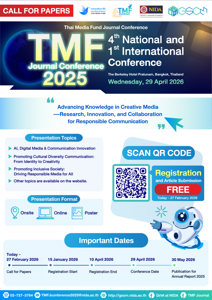 ด้วยคณะนิเทศศาสตร์และนวัตกรรมการจัดการ สถาบันบัณฑิตพัฒนบริหารศาสตร์ ร่วมกับกองทุนพัฒนาสื่อปลอดภัยและสร้างสรรค์ เครือข่ายและคณะการสื่อสารมวลชน มหาวิทยาลัยเชียงใหม่ จัดประชุมวารสารกองทุนพัฒนาสื่อปลอดภัยและสร้างสรรค์ระดับชาติ ครั้งที่ 4 และระดับนานาชาติ ครั้งที่ 1 ประจำปี 2568 “การขับเคลื่อนองค์ความรู้ด้านสื่อ สร้างสรรค์: การวิจัย นวัตกรรม และความร่วมมือเพื่อการสื่อสารอย่างมีความรับผิดชอบ” (ไม่มีค่าใช้จ่าย) ในวันพุธที่ 29 เมษายน 2569 ณ โรงแรมเดอะ เบอร์เคลีย์ประตูน้ำกรุงเทพฯ และออนไลน์ผ่าน Microsoft Teams