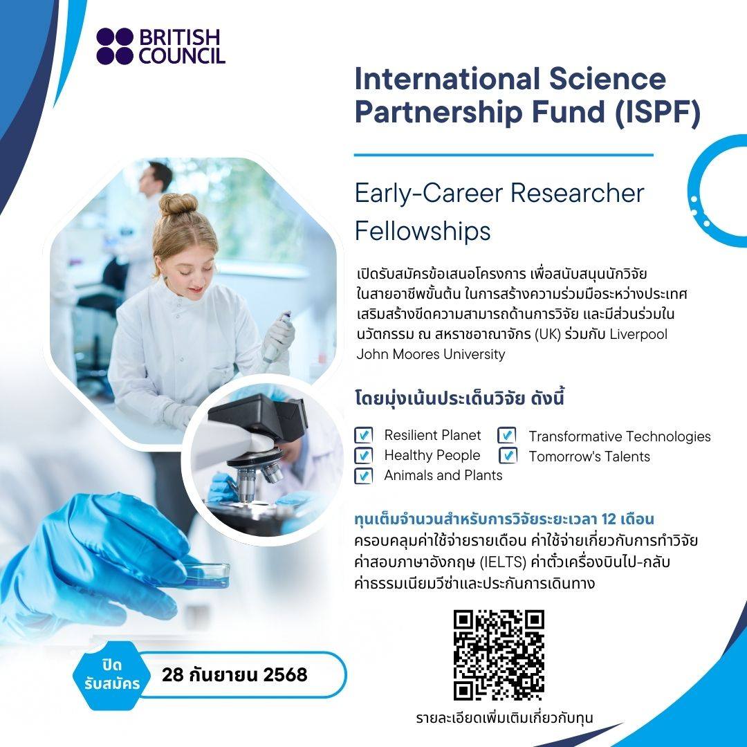สำนักงานปลัดกระทรวงการอุดมศึกษา วิทยาศาสตร์ วิจัยและนวัตกรรม (อว.) ได้ประชาสัมพันธ์โครงการทุนวิจัยระยะสั้นสำหรับนักวิจัยรุ่นใหม่ (ISPF Early-Career Fellowships) ของ บริติช เคานซิล ประเทศไทย ร่วมกับกระทรวงวิทยาศาสตร์ นวัตกรรม และเทคโนโลยีแห่ง สหราชอาณาจักร (UK Department for Science, Innovation, and Technology: DSIT) และมหาวิทยาลัยพันธมิตร ได้แก่ University of Strathclyde, Aston University และ Liverpool John Moores University ซึ่งเป็นโครงการที่จะสนับสนุนนักวิจัยรุ่นใหม่ในการสร้างความร่วมมือด้านการวิจัยระหว่างประเทศ อันจะนำไปสู่การเสริมสร้างขีดความสามารถทางวิชาการ และส่งเสริมการพัฒนานวัตกรรมในระยะยาวต่อไป ทั้งนี้ การรับสมัครเปิดสำหรับนักวิจัยรุ่นใหม่ ที่ดำเนินงานภายใต้ประเด็นสำคัญตามกรอบ International Science Partnerships Fund (ISPF) ได้แก่ Resilient Planet, Healthy People, Animals and Plants, Transformative Technologies และ Tomorrow’s Talent