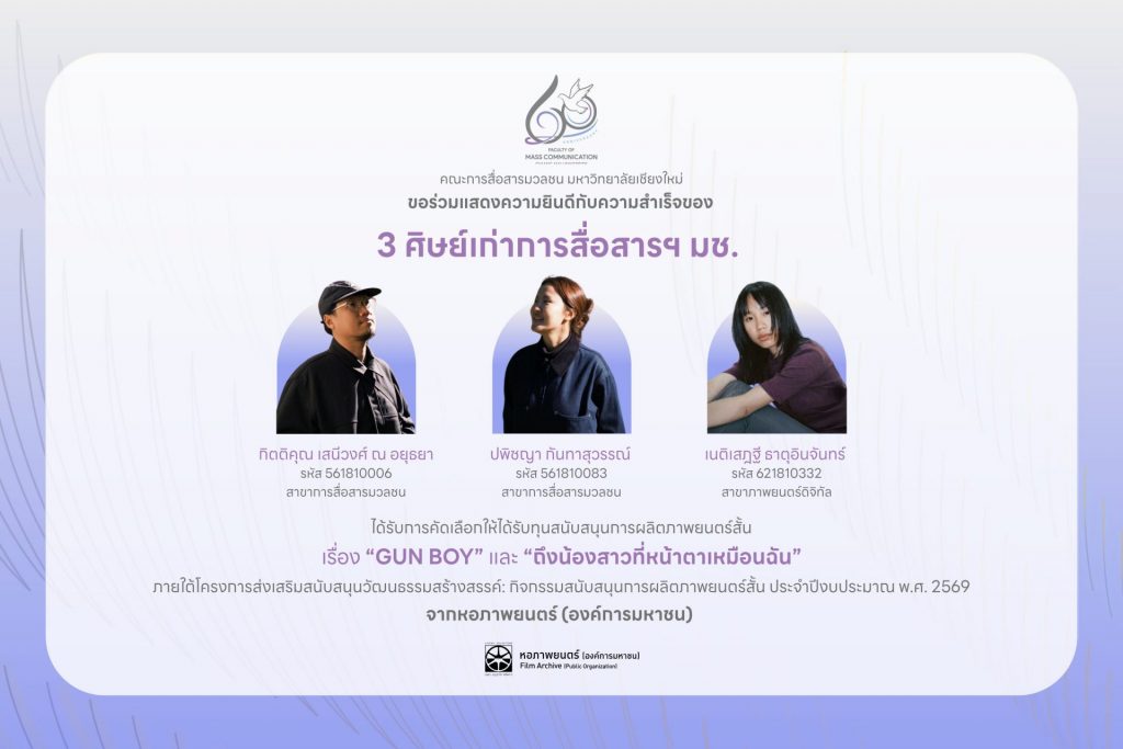 สำหรับผลงานเรื่อง “GUN BOY” กำกับโดย คุณกิตติคุณ เสนีวงศ์ ณ อยุธยา ศิษย์เก่าการสื่อสารมวลชน มหาวิทยาลัยเชียงใหม่ รหัส 561810006 (สาขาการสื่อสารมวลชน) และอำนวยการสร้างโดย คุณปพิชญา กันทาสุวรรณ์ ศิษย์เก่าการสื่อสารมวลชน มหาวิทยาลัยเชียงใหม่ รหัส 561810083 (สาขาการสื่อสารมวลชน) ขณะที่ผลงาน เรื่อง “ถึงน้องสาวที่หน้าตาเหมือนฉัน” กำกับโดย คุณเนติเสฎฐี ธาตุอินจันทร์ ศิษย์เก่าการสื่อสารมวลชน มหาวิทยาลัยเชียงใหม่ รหัส 621810332 (สาขาภาพยนตร์ดิจิทัล) พร้อมทีมงาน ได้รับทุนสนับสนุนจำนวน 150,000 บาท ทั้งนี้ โครงการดังกล่าวจัดขึ้นโดยหอภาพยนตร์ (องค์การมหาชน) เพื่อเปิดโอกาสให้ผู้สร้างสรรค์ผลงานภาพยนตร์สั้นได้พัฒนาทักษะ แสดงศักยภาพ และเตรียมความพร้อมเข้าสู่อุตสาหกรรมภาพยนตร์และสื่อสร้างสรรค์อย่างเป็นระบบ โดยโครงการนี้ยังมุ่งใช้ “ภาพยนตร์” เป็นกลไกสำคัญในการขับเคลื่อนซอฟต์พาวเวอร์ของประเทศ ผ่านการถ่ายทอดศิลปวัฒนธรรม การท่องเที่ยว และอัตลักษณ์ไทย สู่สายตาสาธารณชนในระดับสากล พร้อมทั้งส่งเสริมการเติบโตทางเศรษฐกิจและยกระดับคุณภาพบุคลากรในอุตสาหกรรมสร้างสรรค์