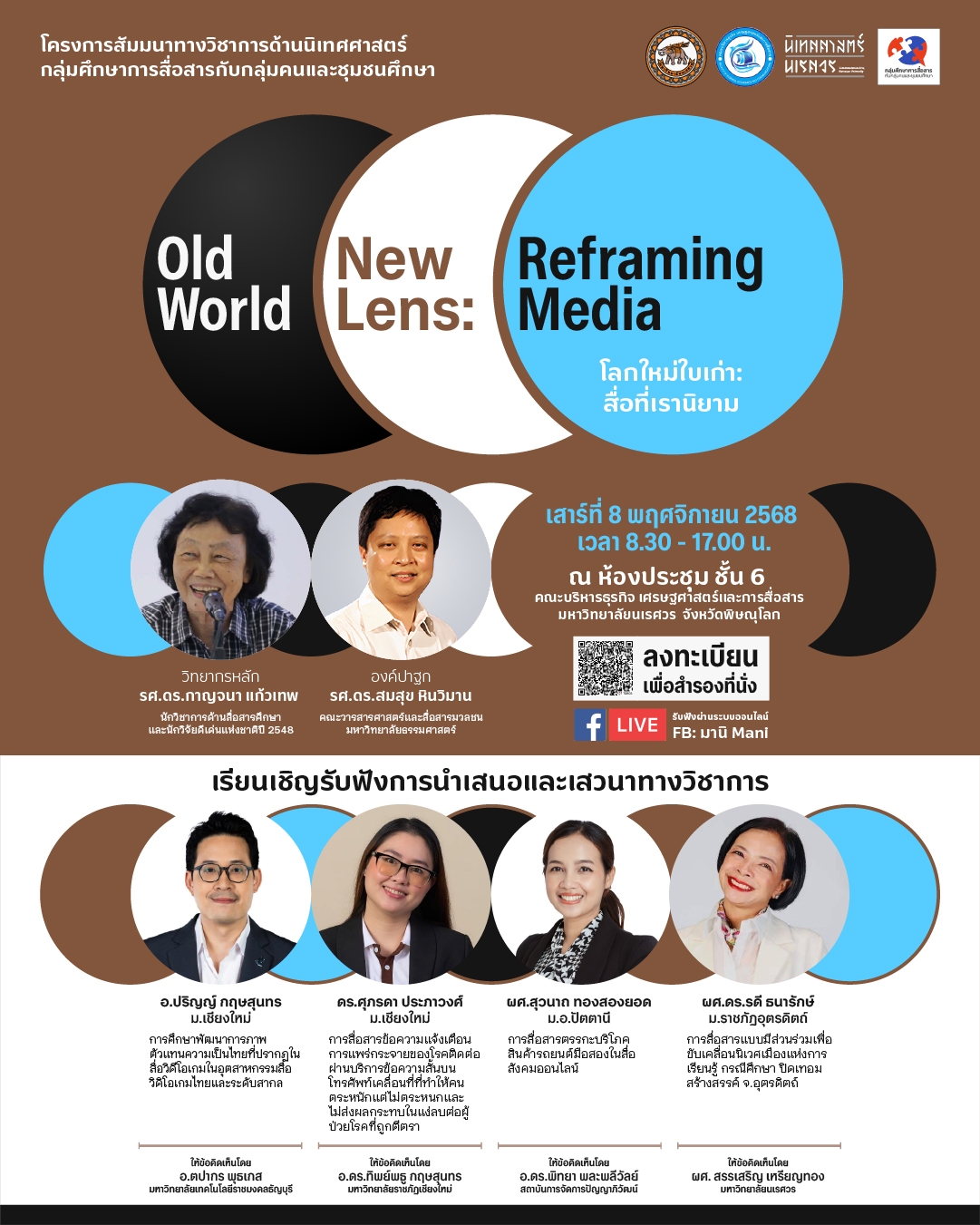 ภาควิชานิเทศศาสตร์ คณะบริหารธุรกิจ เศรษฐศาสตร์และการสื่อสาร มหาวิทยาลัยนเรศวร ร่วมกับกลุ่มศึกษาการสื่อสารกับกลุ่มคนและชุมชนศึกษา ขอความอนุเคราะห์ประชาสัมพันธ์และขอเรียนเชิญเข้าร่วมโครงการสัมมนาทางวิชาการด้านนิเทศศาสตร์ หัวข้อ “โลกใหม่ใบเก่า: สื่อที่เรานิยาม” ในวันเสาร์ที่ 8 พฤศจิกายน 2568 เวลา 08.30-17.00 น. ณ ห้องประชุม BEC6201 (Convention Hall) ชั้น 6 อาคารคณะบริหารธุรกิจ เศรษฐศาสตร์และการสื่อสาร มหาวิทยาลัยนเรศวร จังหวัดพิษณุโลก และ Live ผ่าน Facebook: มานิ Mani เพื่อให้คณาจารย์และนักศึกษาได้แลกเปลี่ยนองค์ความรู้ด้านนิเทศศาสตร์และการสื่อสาร โดยมี อาจารย์ปริญญ์ กฤษสุนทร อาจารย์ประจำคณะการสื่อสารมวลชน มหาวิทยาลัยเชียงใหม่ เป็นผู้ร่วมนำเสนอในหัวข้อ “การศึกษาพัฒนาการภาพตัวแทนความเป็นไทยที่ปรากฏในสื่อวิดีโอเกมในอุตสาหกรรมสื่อวิดีโอเกมไทยและระดับสากล”